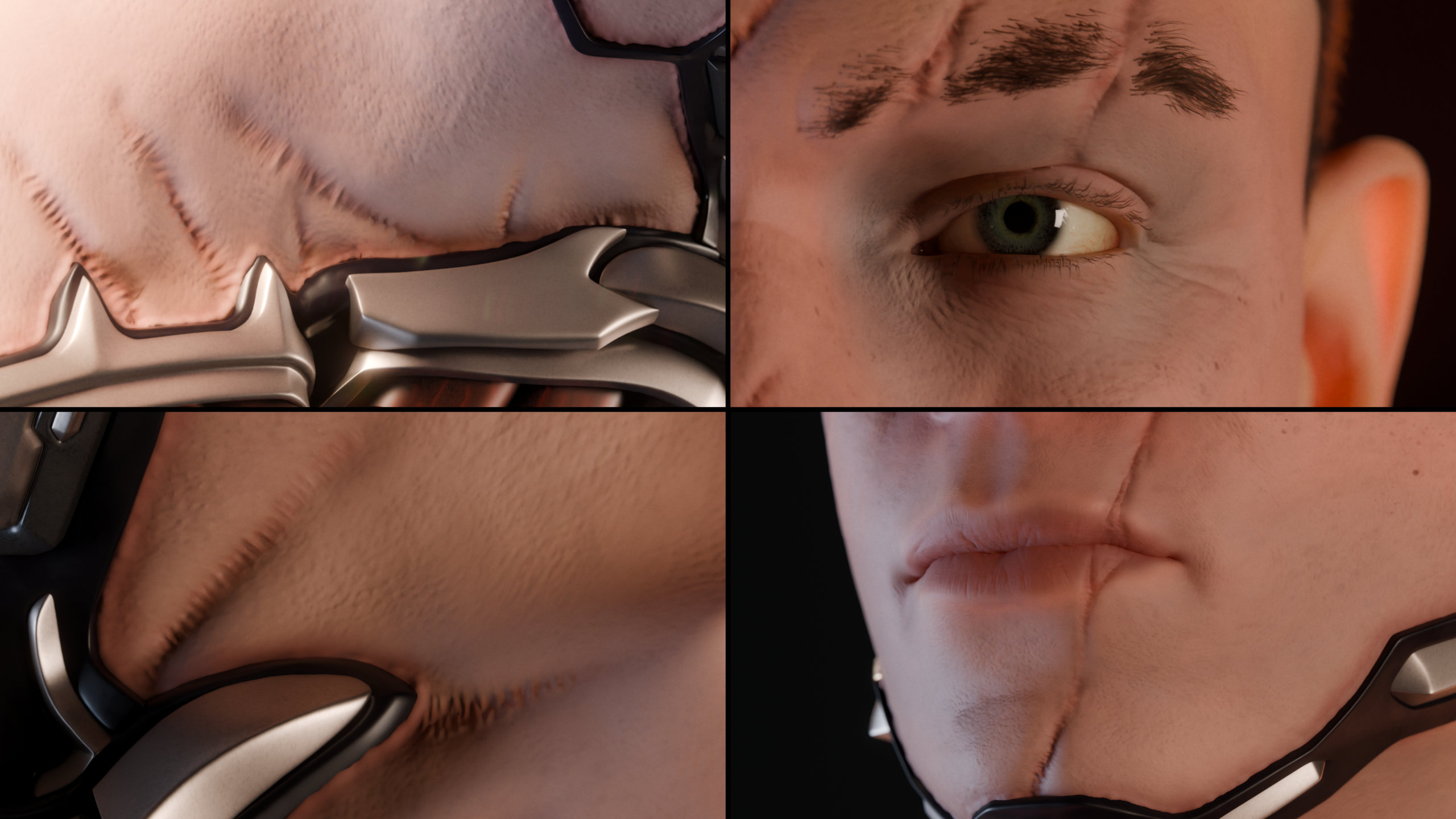 The skin covering the head, shoulder and hand was painstakingly stamped and sculpted with pore detail. I then baked these details down into a texture to transfer all these details onto a mesh with a lower subD level. I also carved the scars by hand and refined them with uneven bumps in the skin.