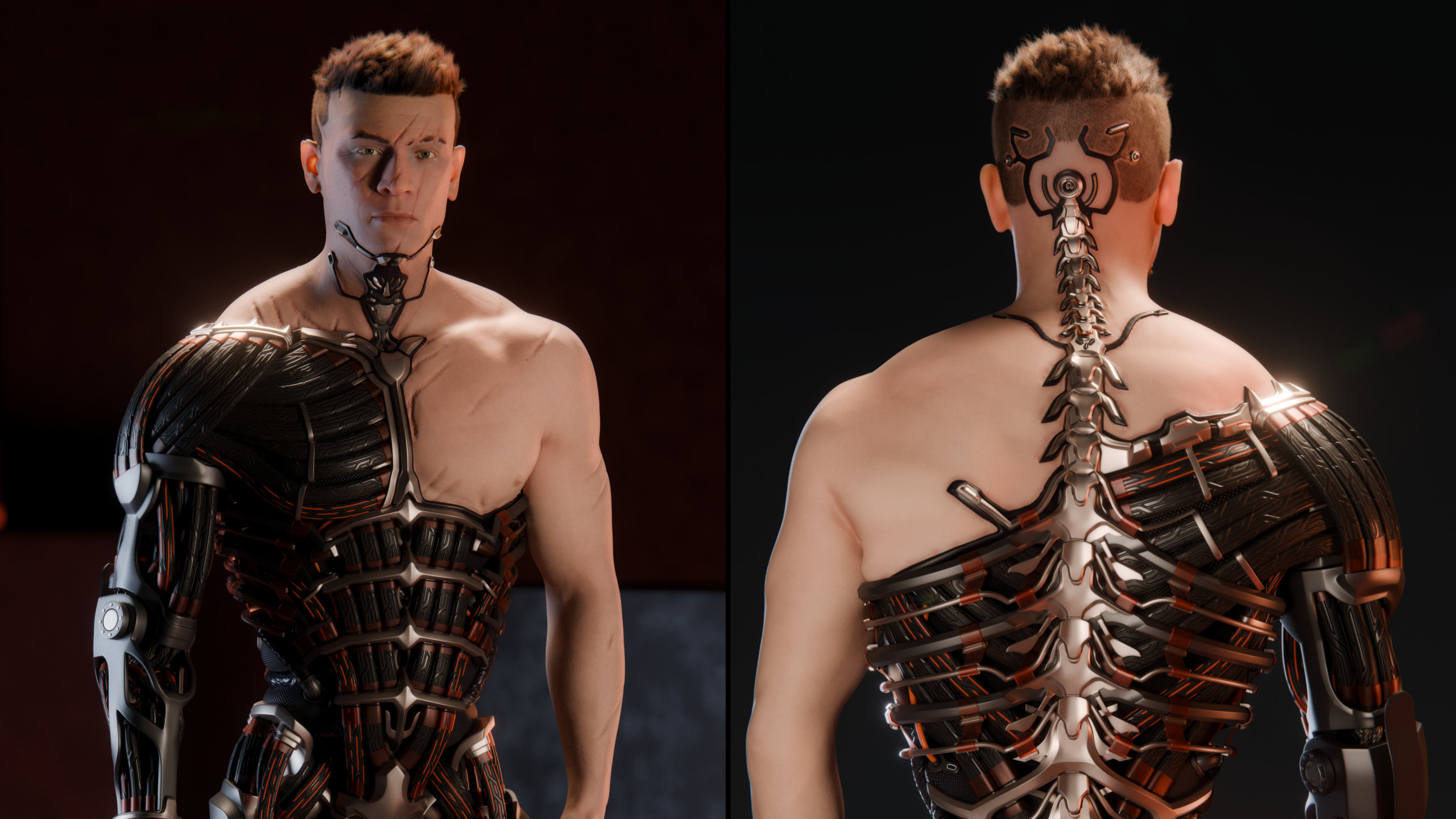 Just like the human spine, this cybernetic equivalent is the structural and neurological backbone of the body. It is segmented, with the segments changing size depending on their position on the spine. Cables connect the entire structure. The connection points are covered by metal flaps that stick to the segment below through magnets.