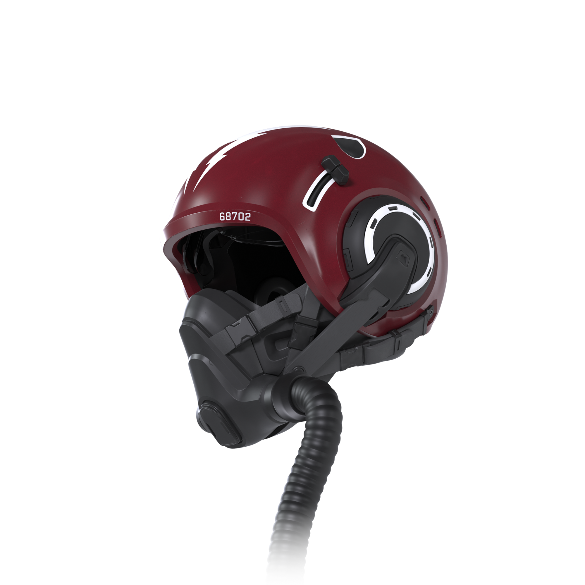 The mask is lightweight and features a symmetrical design, so that the in- and outputs can be configured as desired. The mask is attached via two buckles and can be disconnected by pulling the small handles on either side of the helmet. Four pull straps allow for proper fitting of the mask. The microphone module sits in the front and is connected to the main data line through a splitter and AUX port. The oxygen hose, which also carries an aditional pressure line from the G-suit system, can be screwed in on the left or right side.