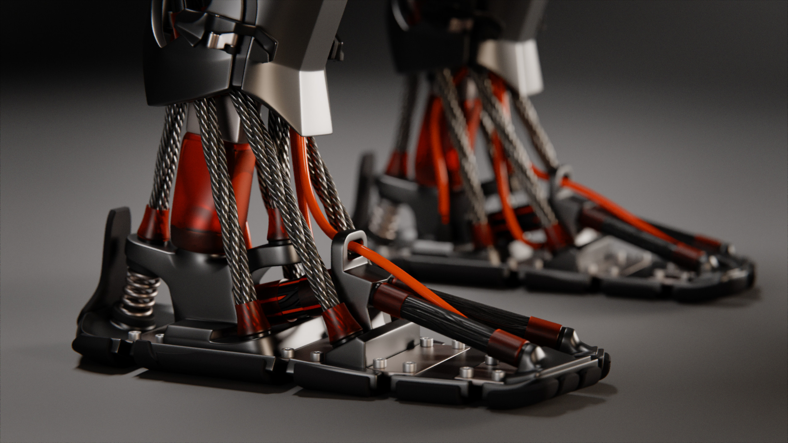 The feet are designed around multiple base plates that are joined together by thin titanium plates. These plates allow for elastic deformation and bring the foot back to its flat shape when not under pressure. The ball joint allows flexibility and is protected by a rubber cover.