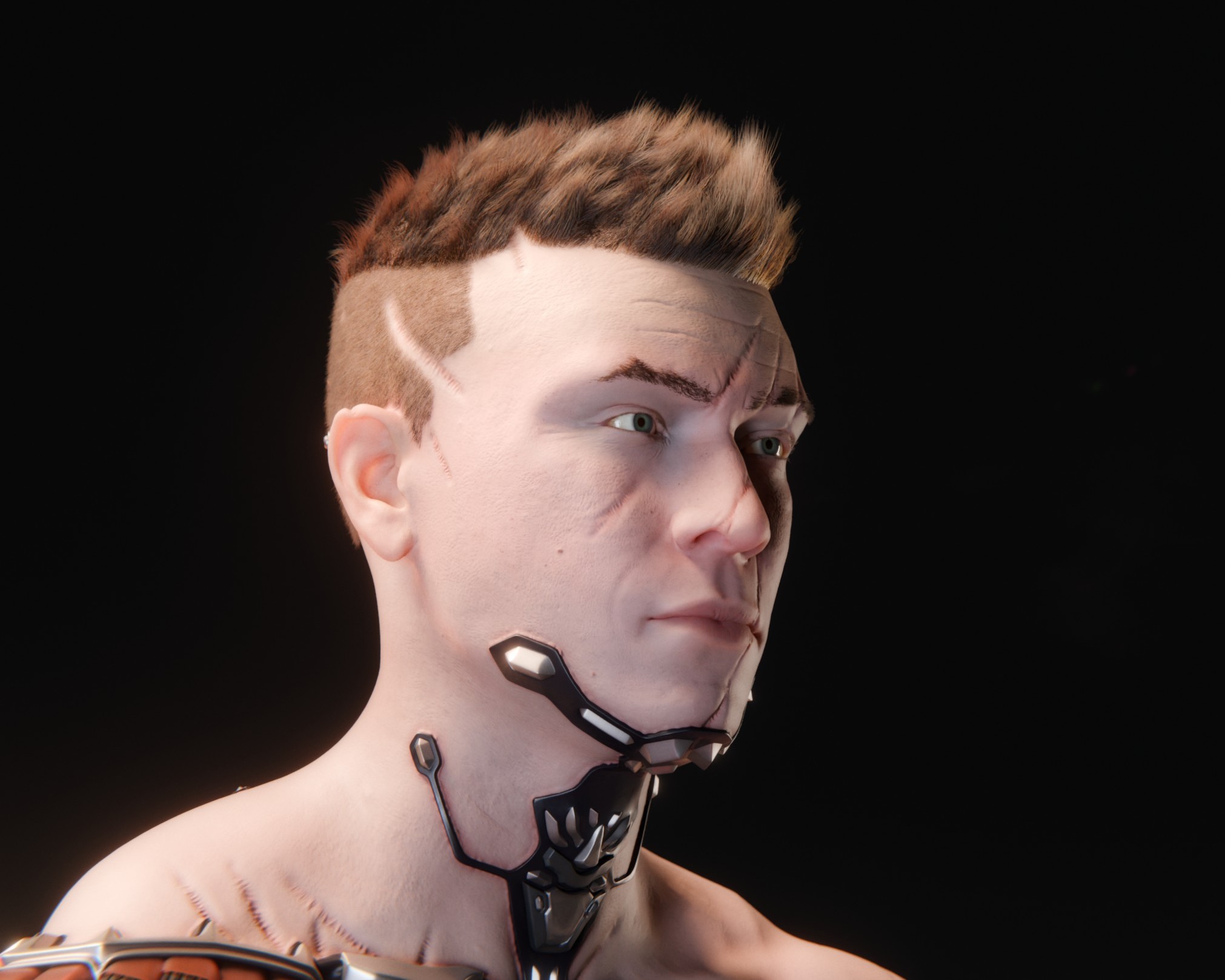 The skin covering the head, shoulder and hand was painstakingly stamped and sculpted with pore detail. I then baked these details down into a texture to transfer all these details onto a mesh with a lower subD level. I also carved the scars by hand and refined them with uneven bumps in the skin.