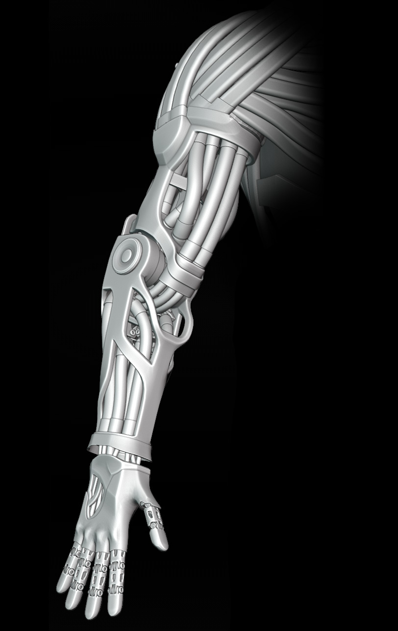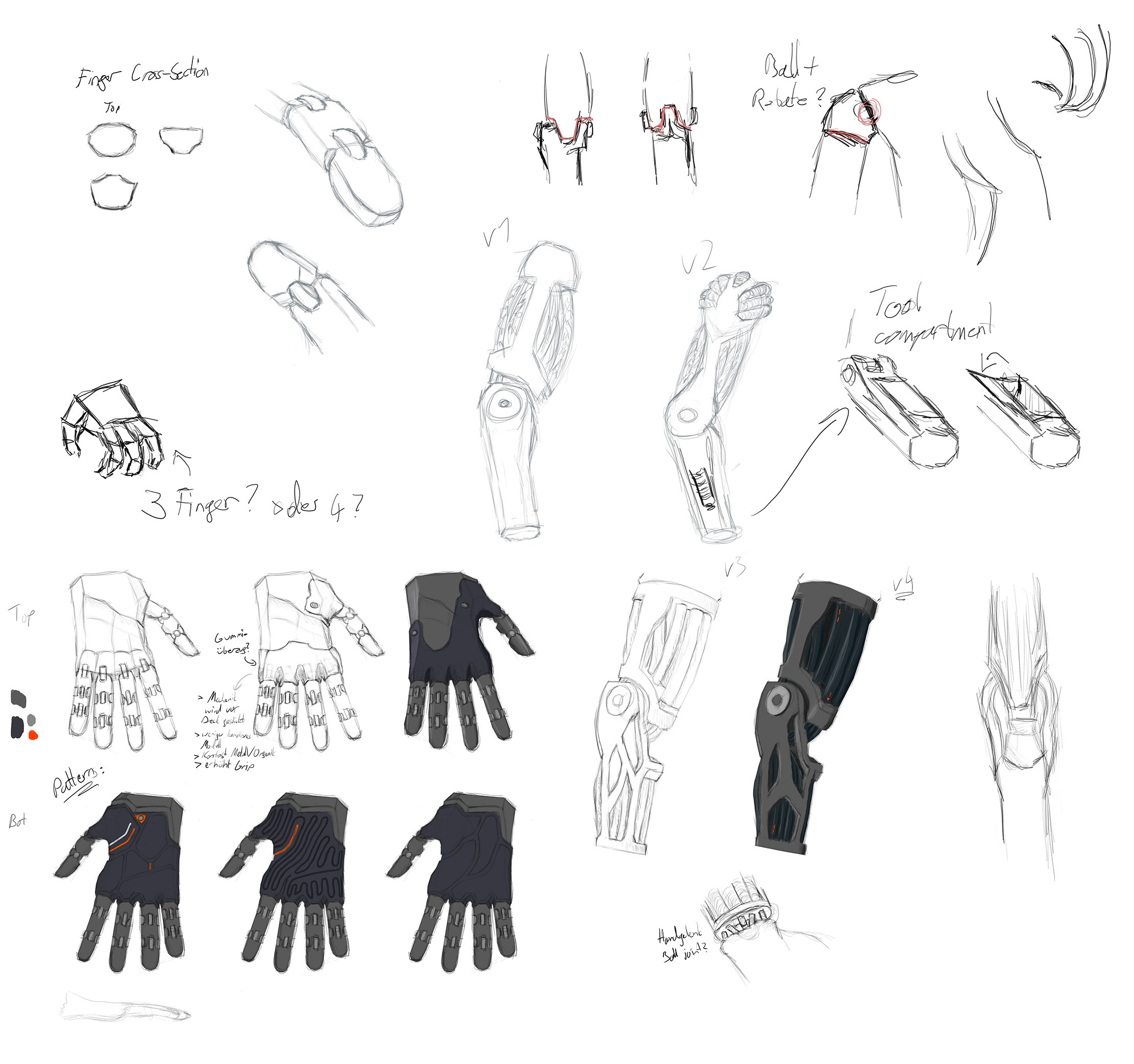 One of these being the robotic arm, along with helmet it would be a visual highlight that the viewer might be drawn to, and so it was important to establish its design. I went through multiple iterations, going back to concepting and taking in feedback. I landed on a bionic approach, where artificial muscles and tendons weave through skeletal metal structures. This design really resonated with me and established the look of the cybernetic parts that were still unmodelled at that point.