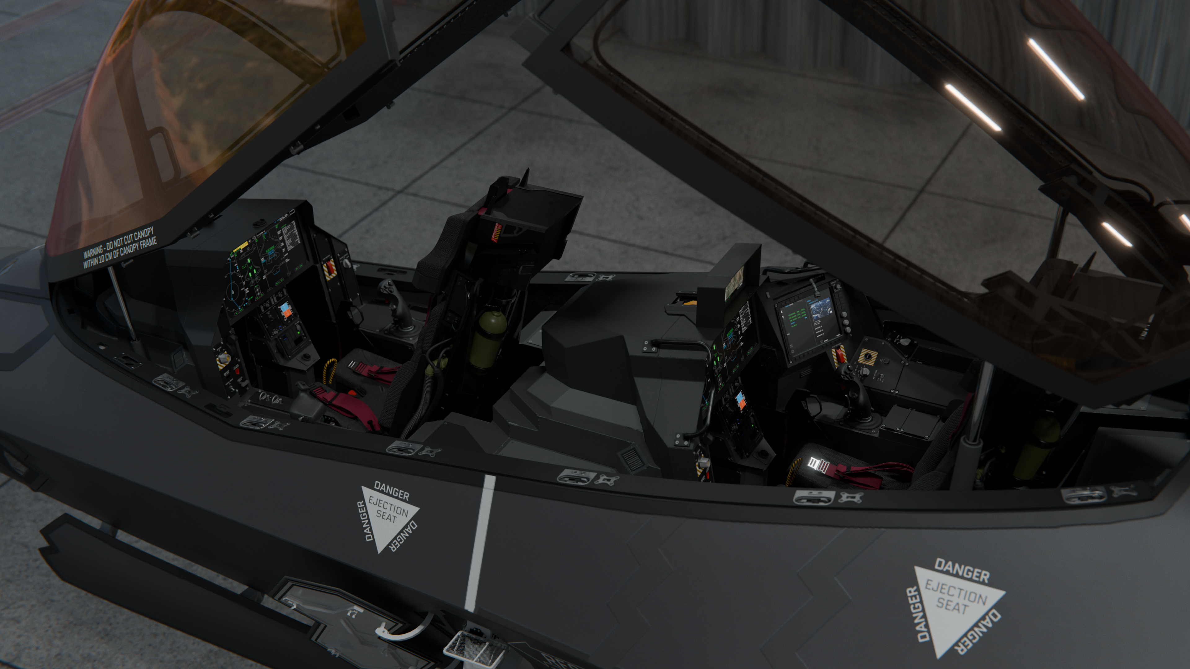 The cockpit of the F-35 is dominated by the touch controlled PCD, or Primary Control Display. It features a highly customizable interface made up of up to 4 columns and a info bar at the top, linking to the most important controls.