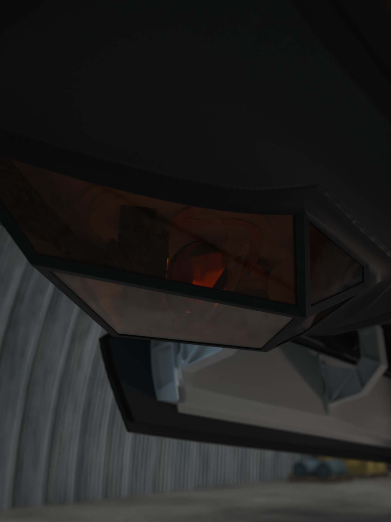 The back houses some of the local computing elements. Most of the HUD computation is handled by the aircraft, but the display adapter sits in this module. The device is fully powered by a high-bandwidth USB-C connection that plugs into the back, which also sends the image and audio data. Below that a connection to the G-suit can be made. In high-G-turns, the helmet can press itself harder onto the head to stay in place. The entire helmet and mask is set up in a way that these connections can also be plugged in from the right side, if the aircraft is a different model or the crew member prefers. The unused connectors get covered up with small plates that snap to the module magnetically. Above the compute module sits the IR reflector module, which wraps itself around the back shell. It works together with the IR sensors embedded in the seat to accurately meassure the precise location and rotation of the head. The rear assembly also serves as a counterweight to the front, balancing the helmet on the head for comfort.