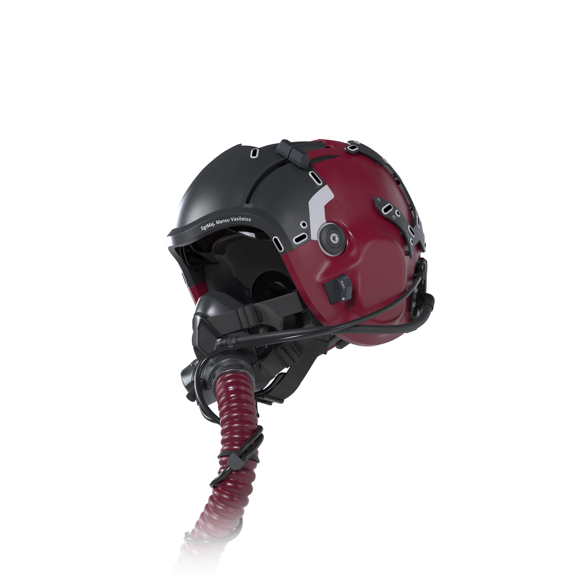 The mask is lightweight and features a symmetrical design, so that the in- and outputs can be configured as desired. The mask is attached via two buckles and can be disconnected by pulling the small handles on either side of the helmet. Four pull straps allow for proper fitting of the mask. The microphone module sits in the front and is connected to the main data line through a splitter and AUX port. The oxygen hose, which also carries an aditional pressure line from the G-suit system, can be screwed in on the left or right side.